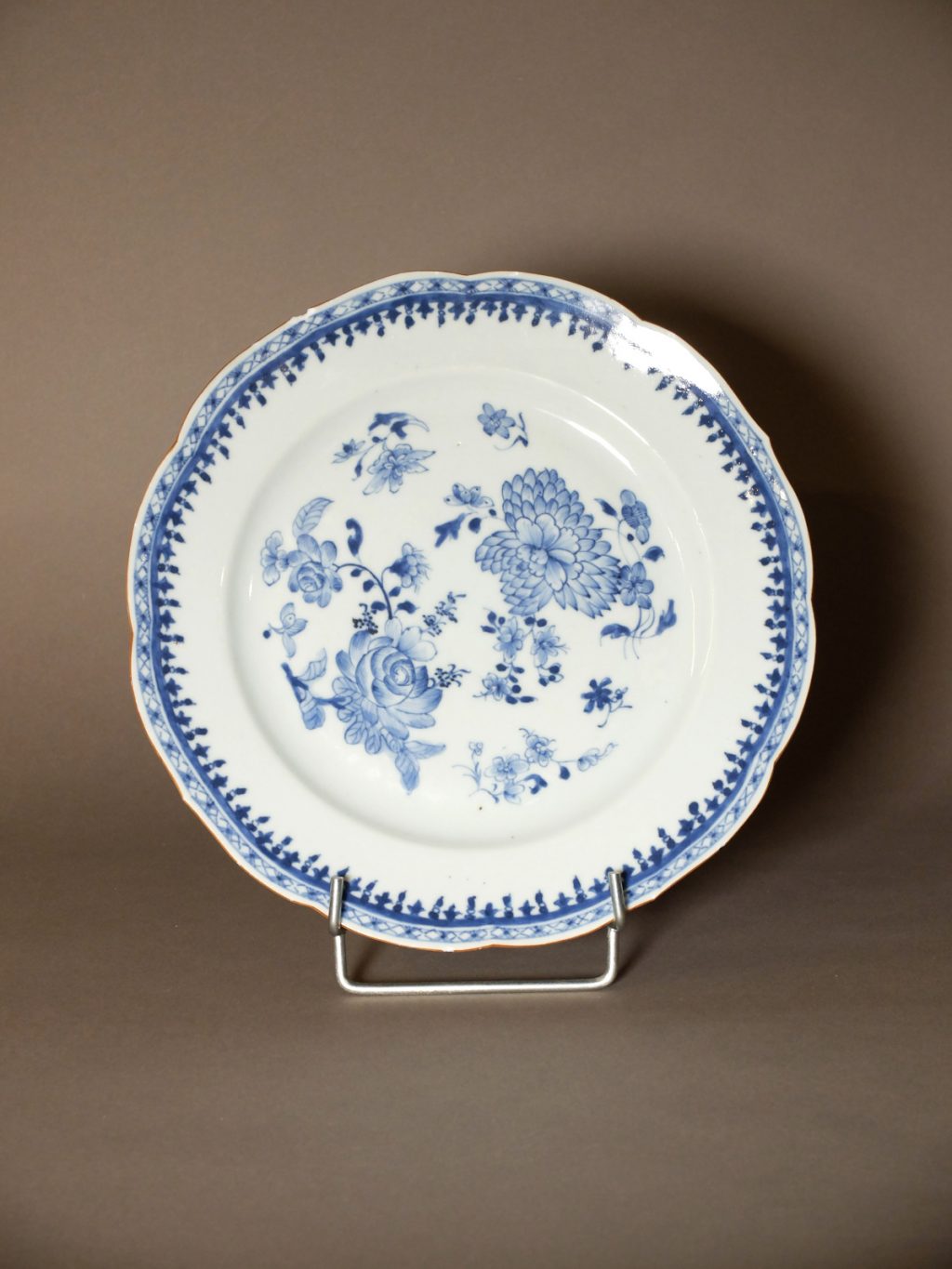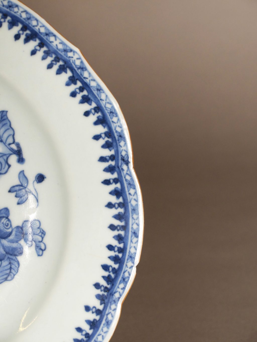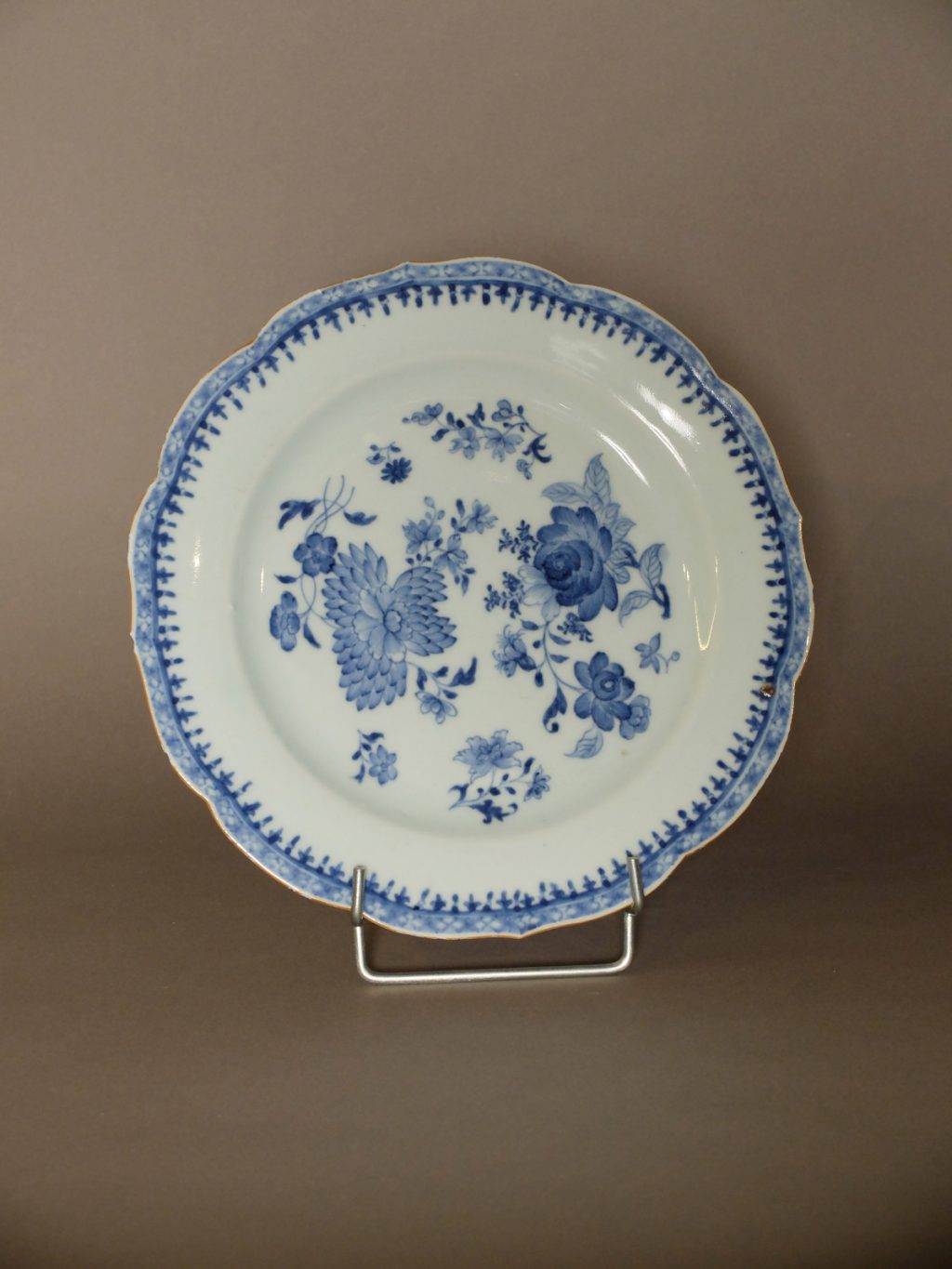 3 assiettes en porcelaine bleue et blanche, de forme polylobée, à décor de fleurs.