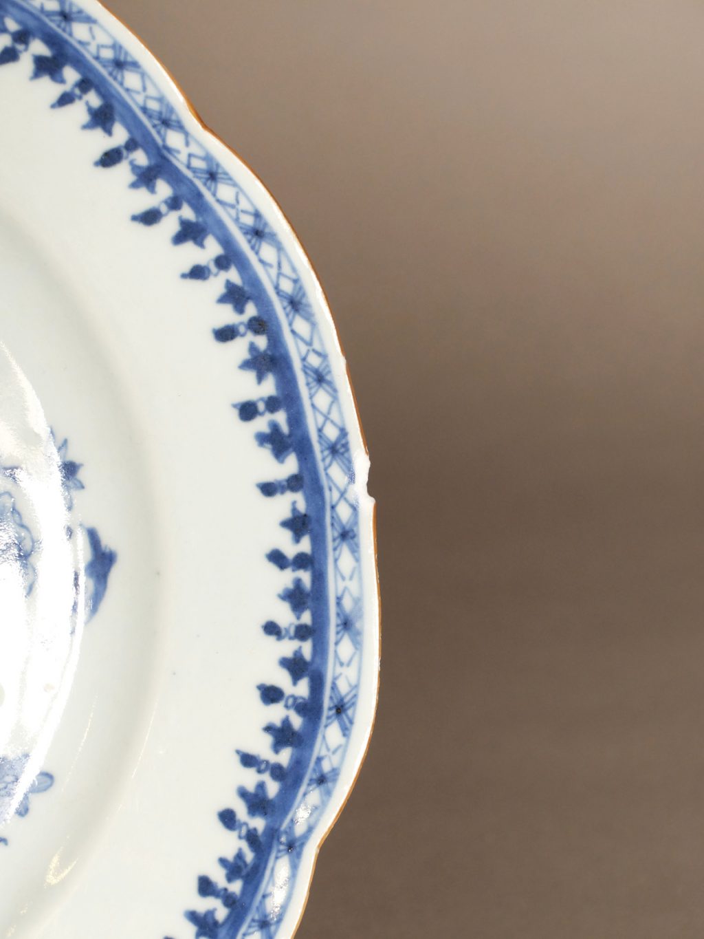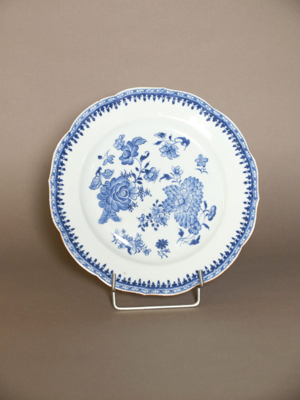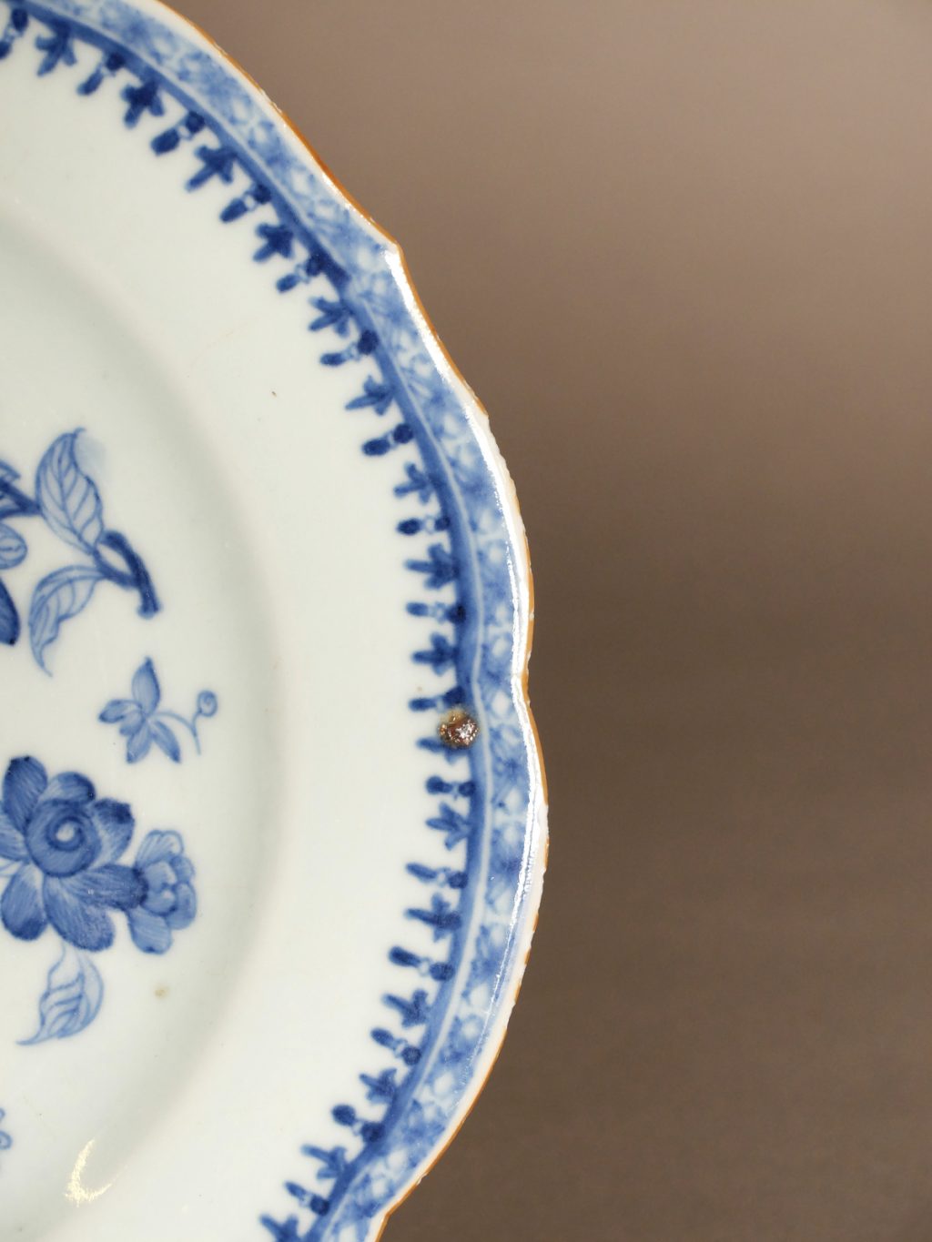 3 assiettes en porcelaine bleue et blanche, de forme polylobée, à décor de fleurs.