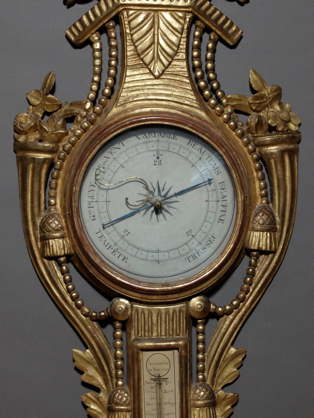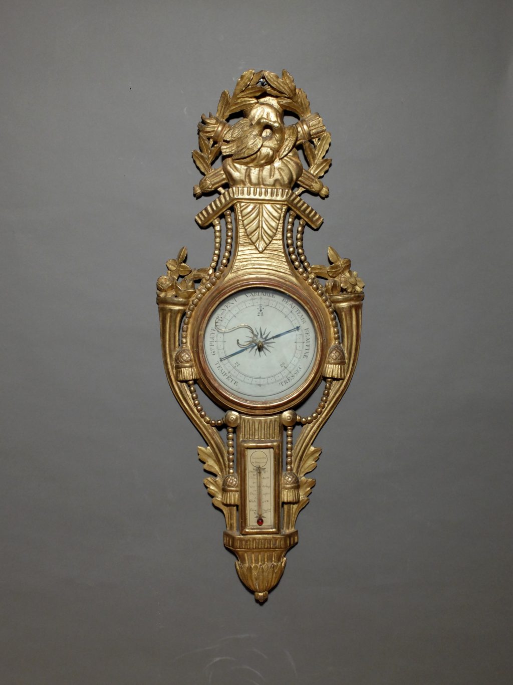 Baromètre-thermomètre en bois finement sculpté et doré. Au centre, un oculus permet la lecture par une aiguille et un index serpentin. Encadré de cornes d’abondances, il est sommé d’un couple de colombes, symbolisant l’Amour et de la fidélité, couronné de lauriers.