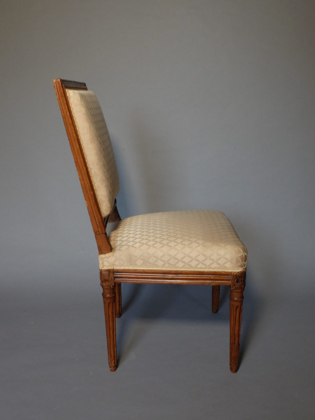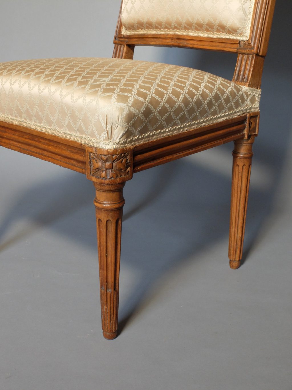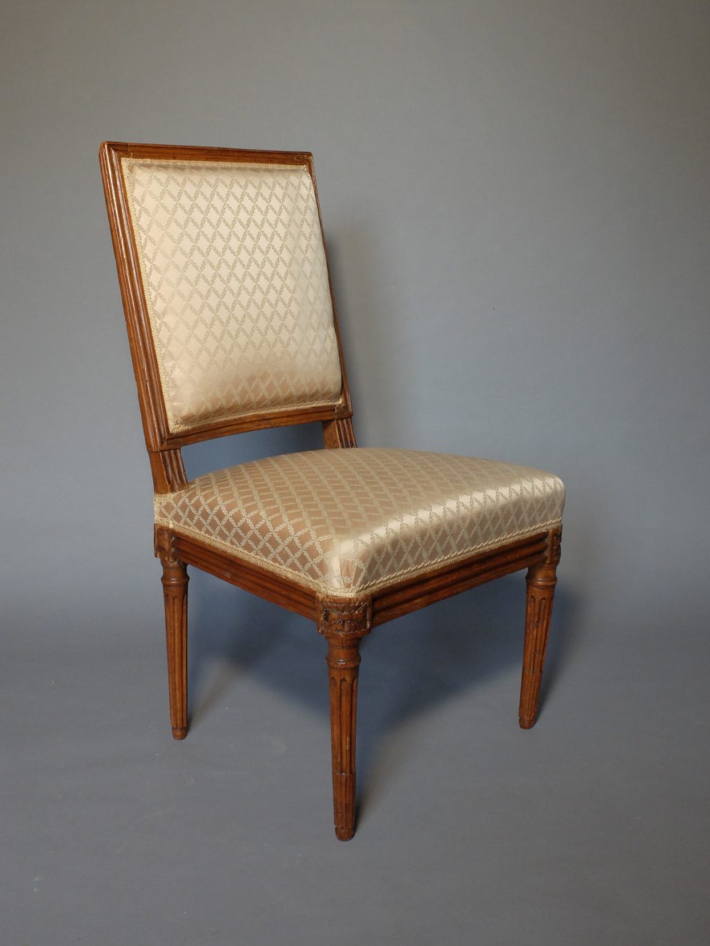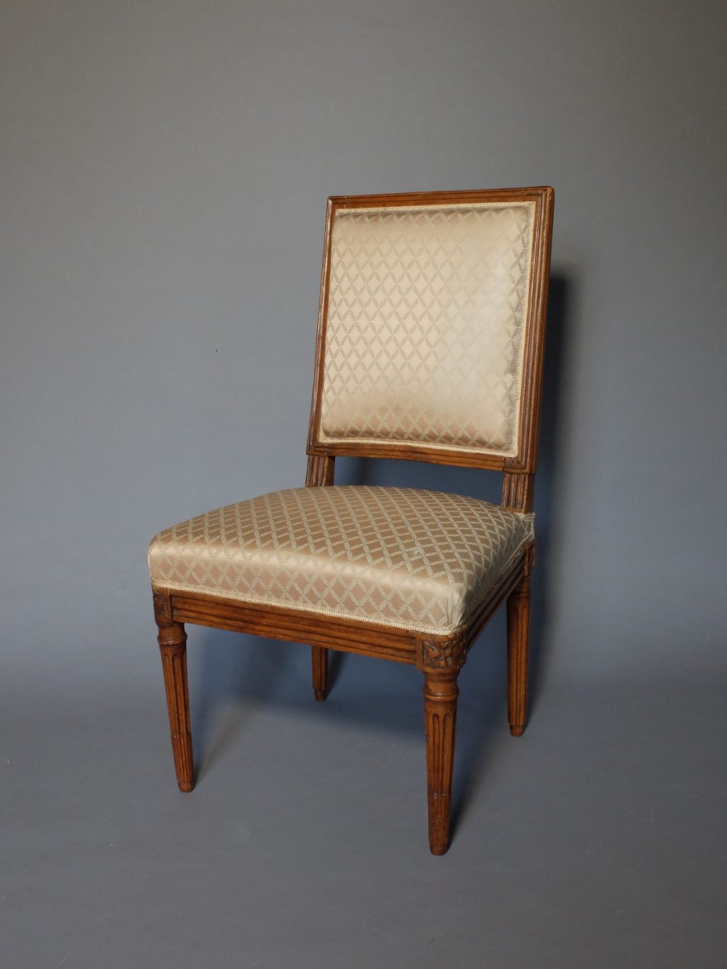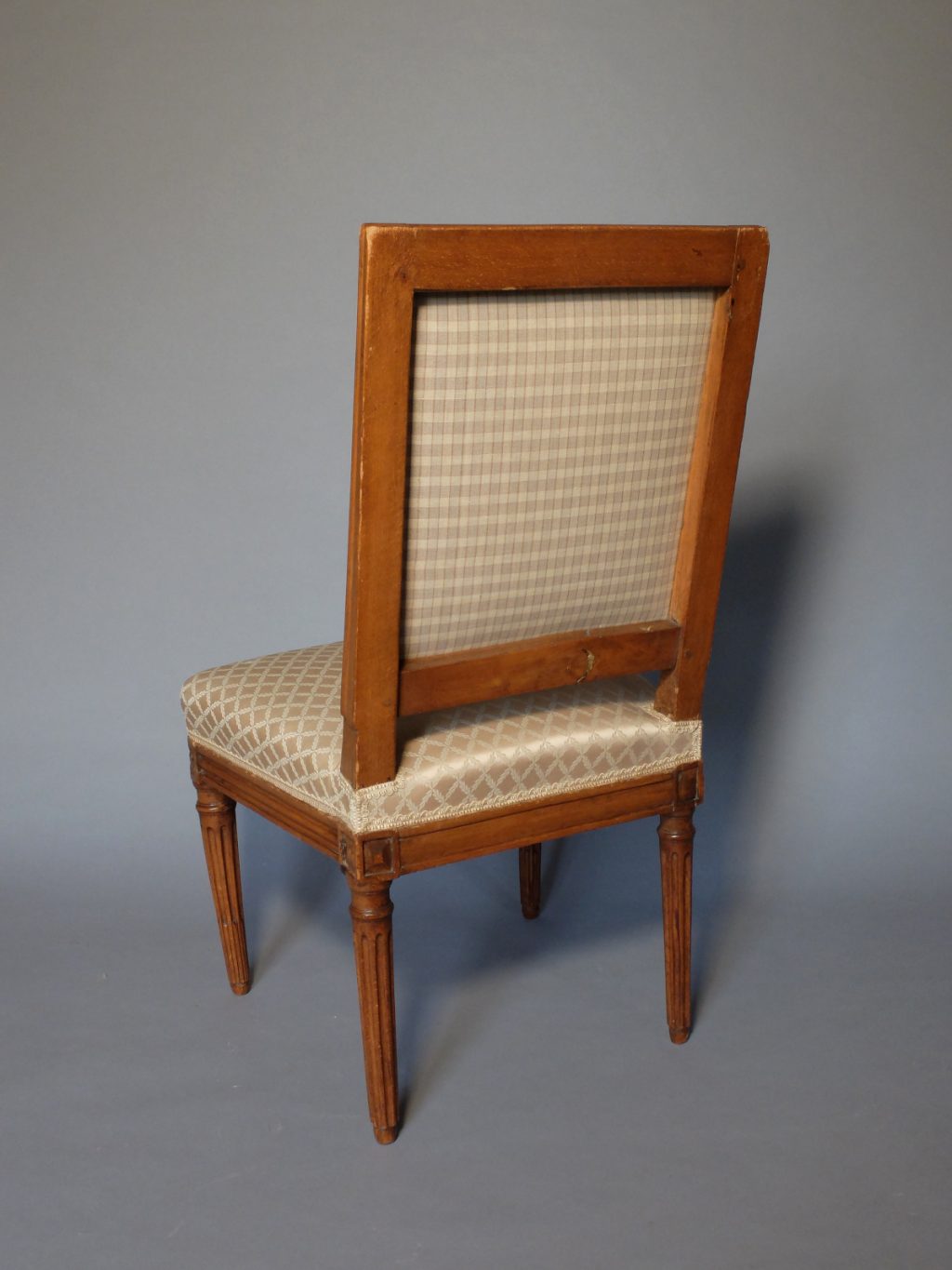 Jolie chaise en bois de hêtre, reposant sur quatre pieds fuselés, cannelés et rudentés à l’avant. Les ceintures moulurées viennent se raccorder aux pieds par un carré sculpté d’un feuillage et arrondi en haut des pieds antérieurs.