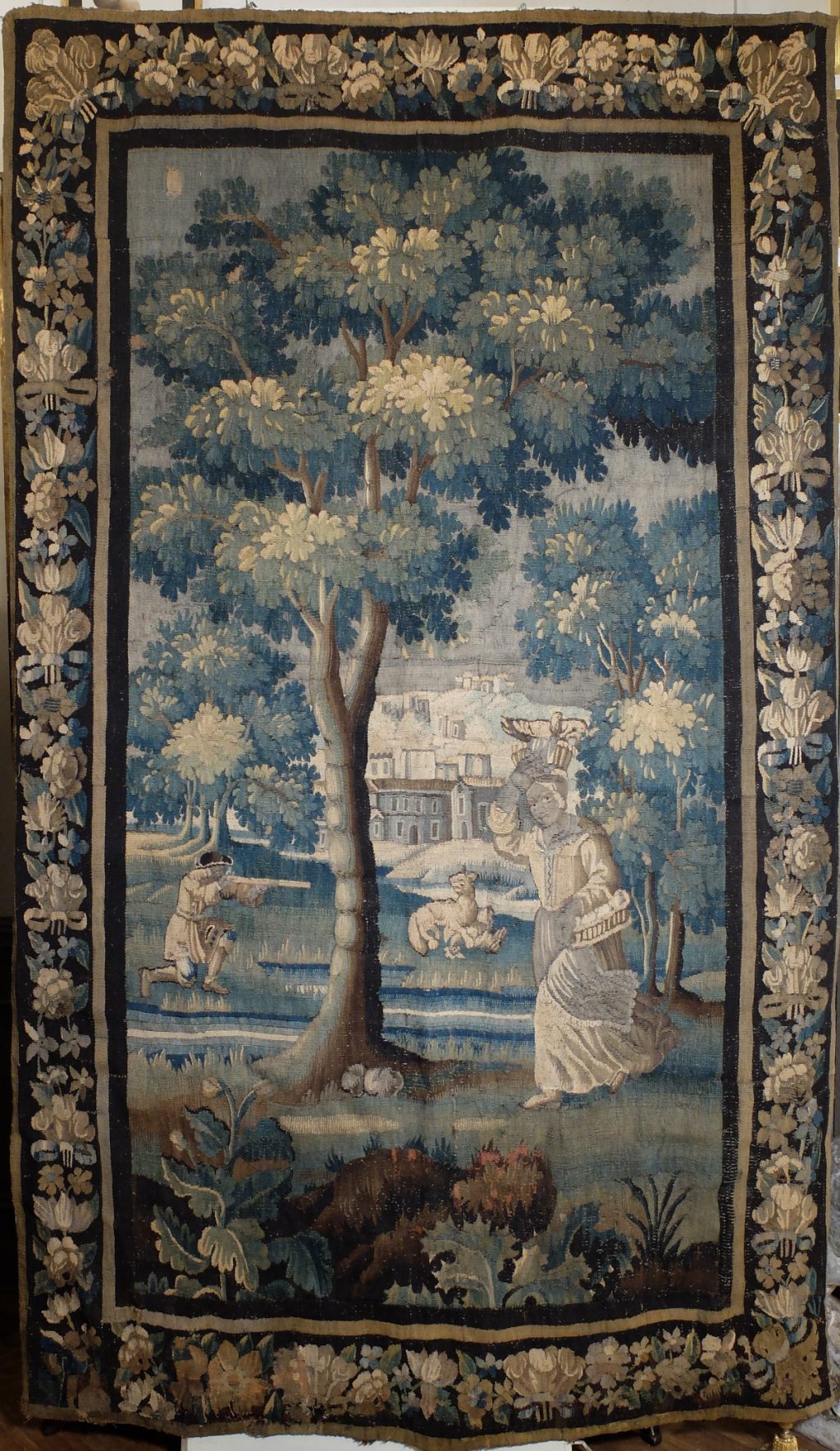Tapisserie en laine et soie, représentant une lavandière au premier plan, portant sur sa tête et au bras deux panier. Au second plan, un chasseur met en joue un animal (renard?) devant un décor de verdure, d’arbres et d’un village dans le lointain.
