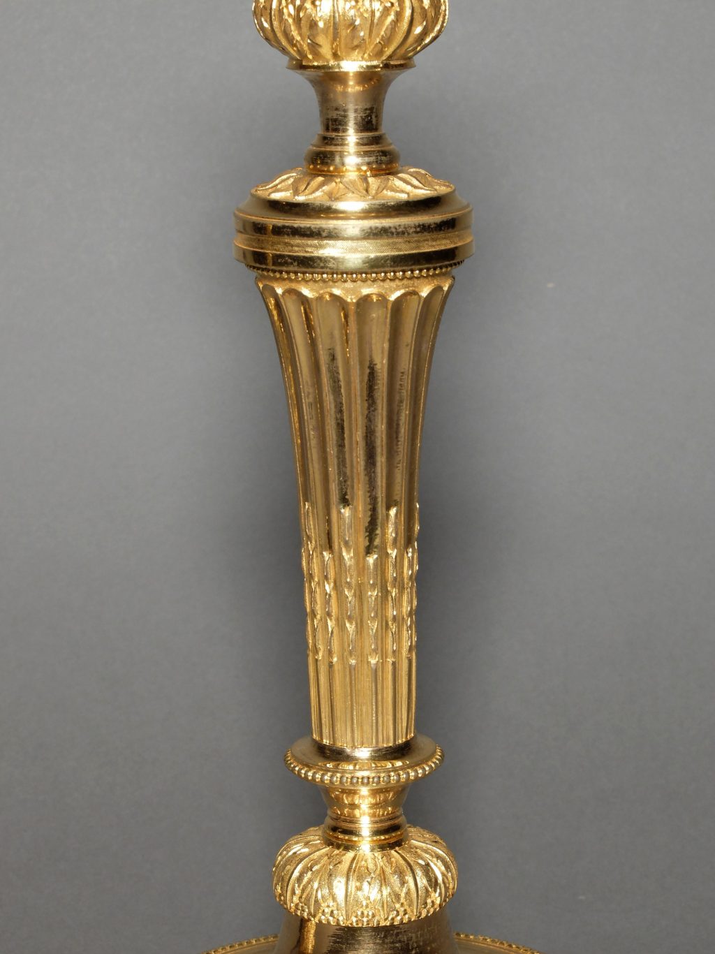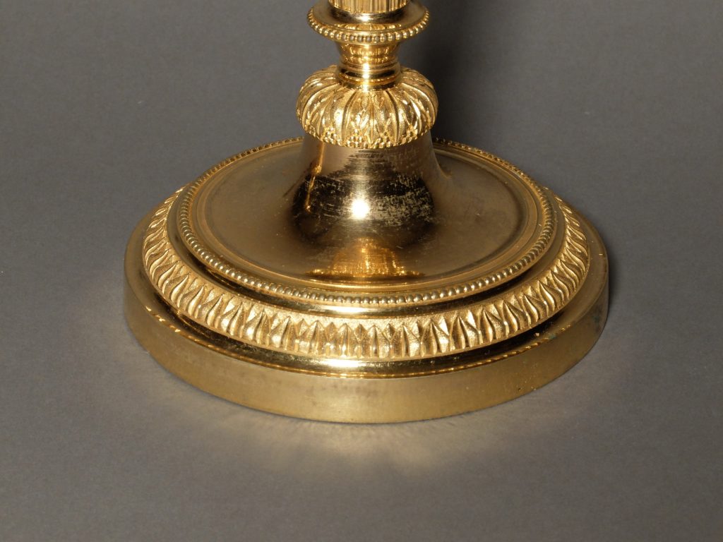 La base ronde est agrémentée d’une frise de feuilles d’eau surmontée d’un perlé. Le fût cannelé et rudenté d’asperges soutient un binet rond sur lequel nous retrouvons notre décor de feuilles d’eau.