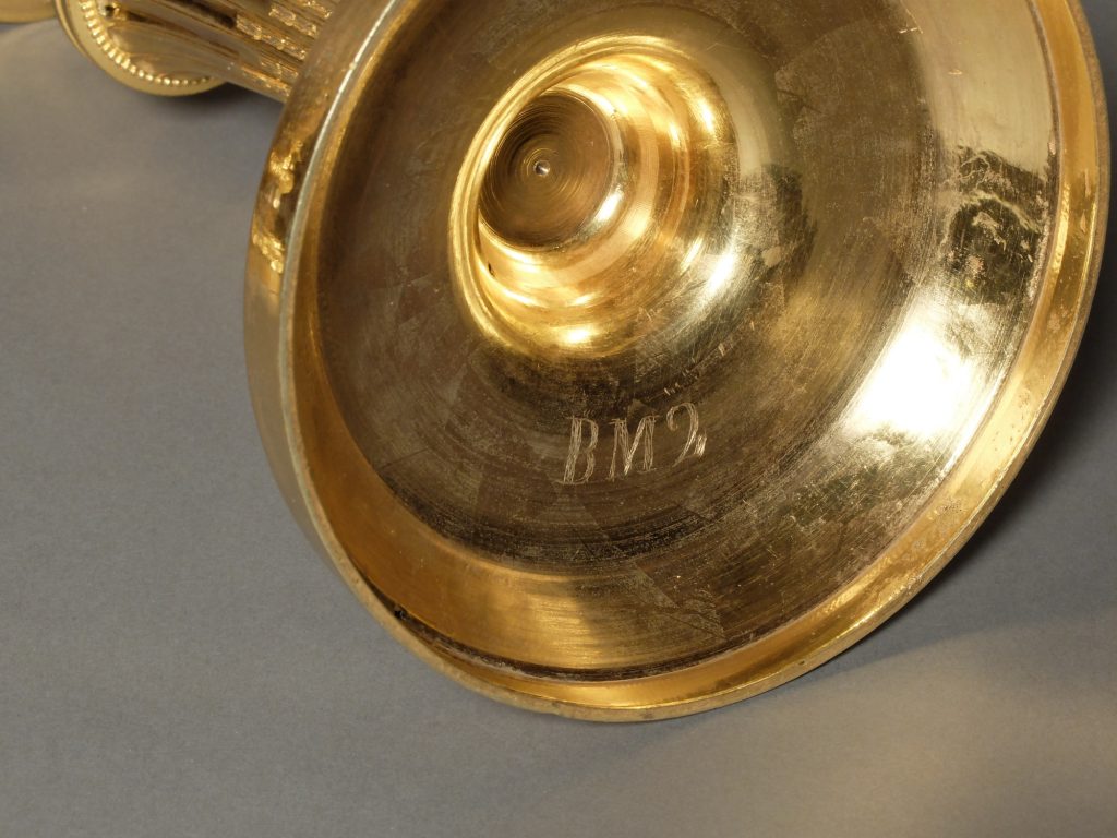 Sous la base de chaque bougeoir, une inscription « BM2 » est gravée.