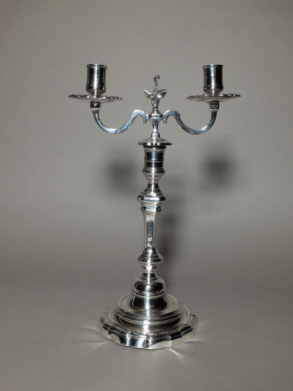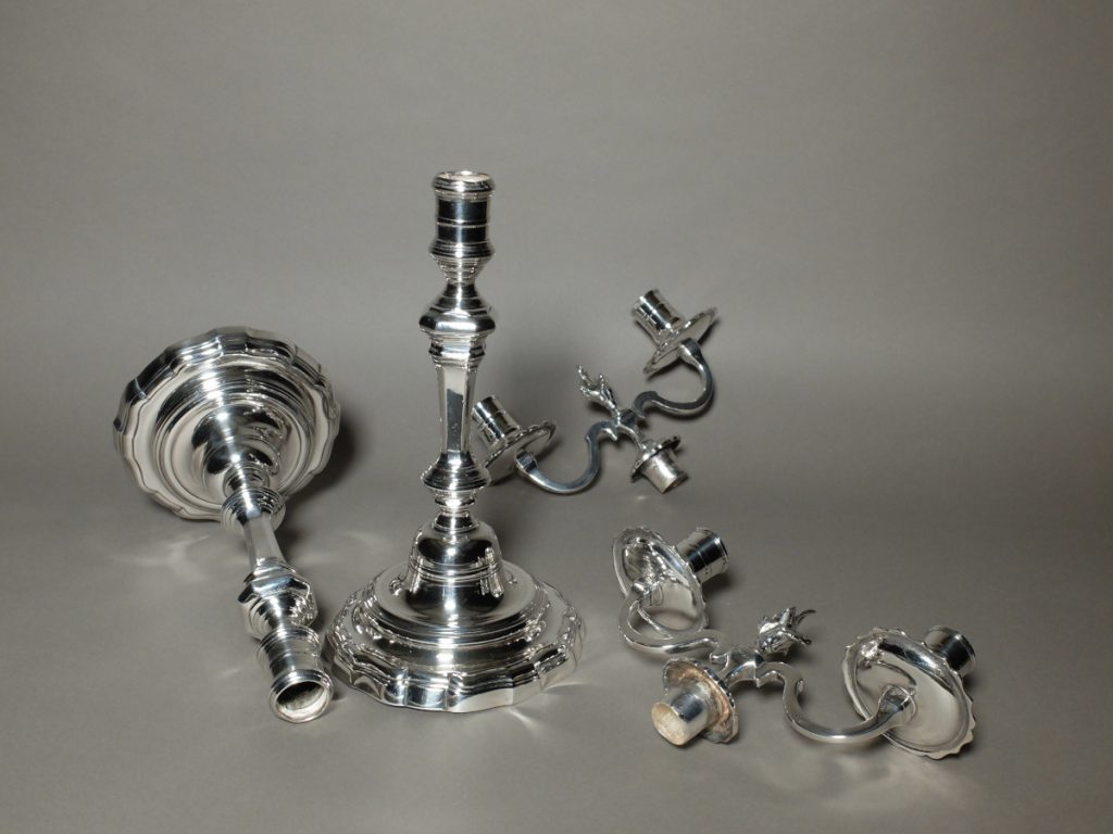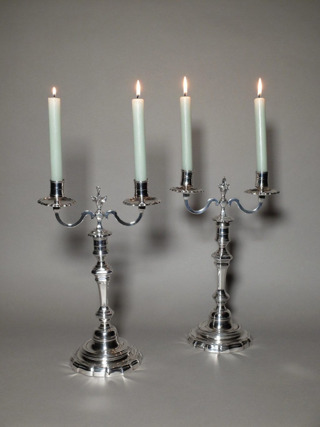 Les bougeoirs de forme chantournée et moulurée, le fût à pans et le binet cylindrique mouluré, supportent un bouquet de 2 feux amovibles permettant d’utiliser ces luminaires soit en paire de bougeoirs soit en bouts de table.