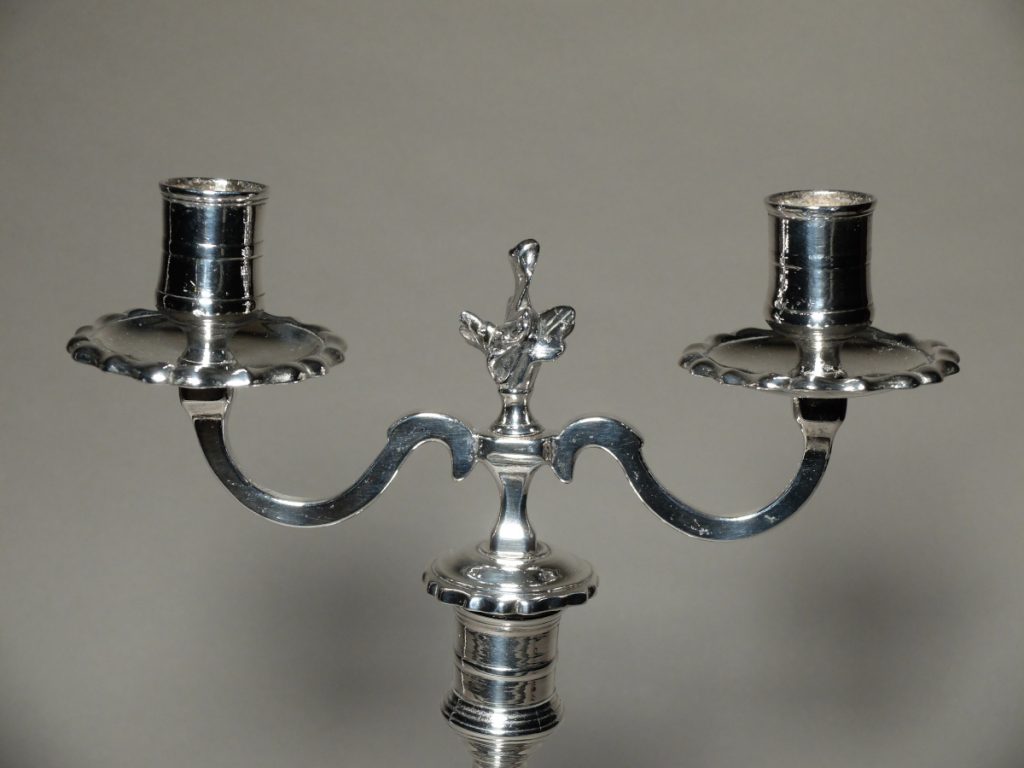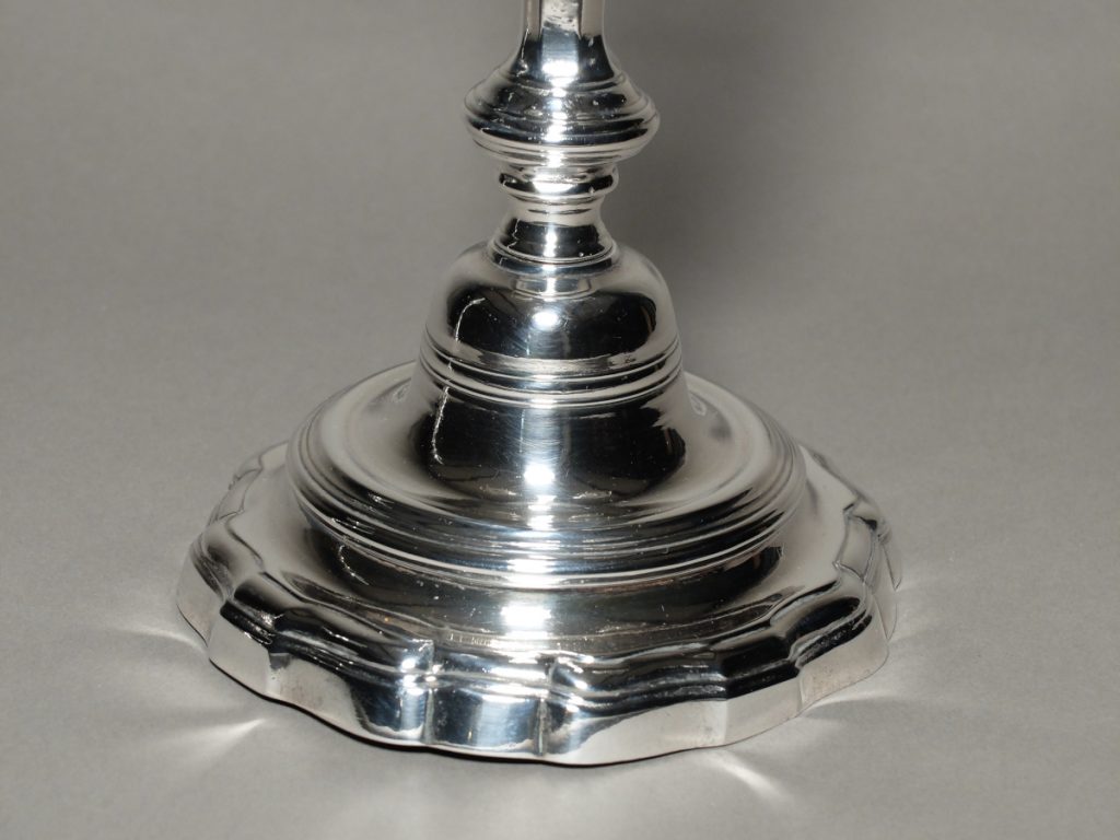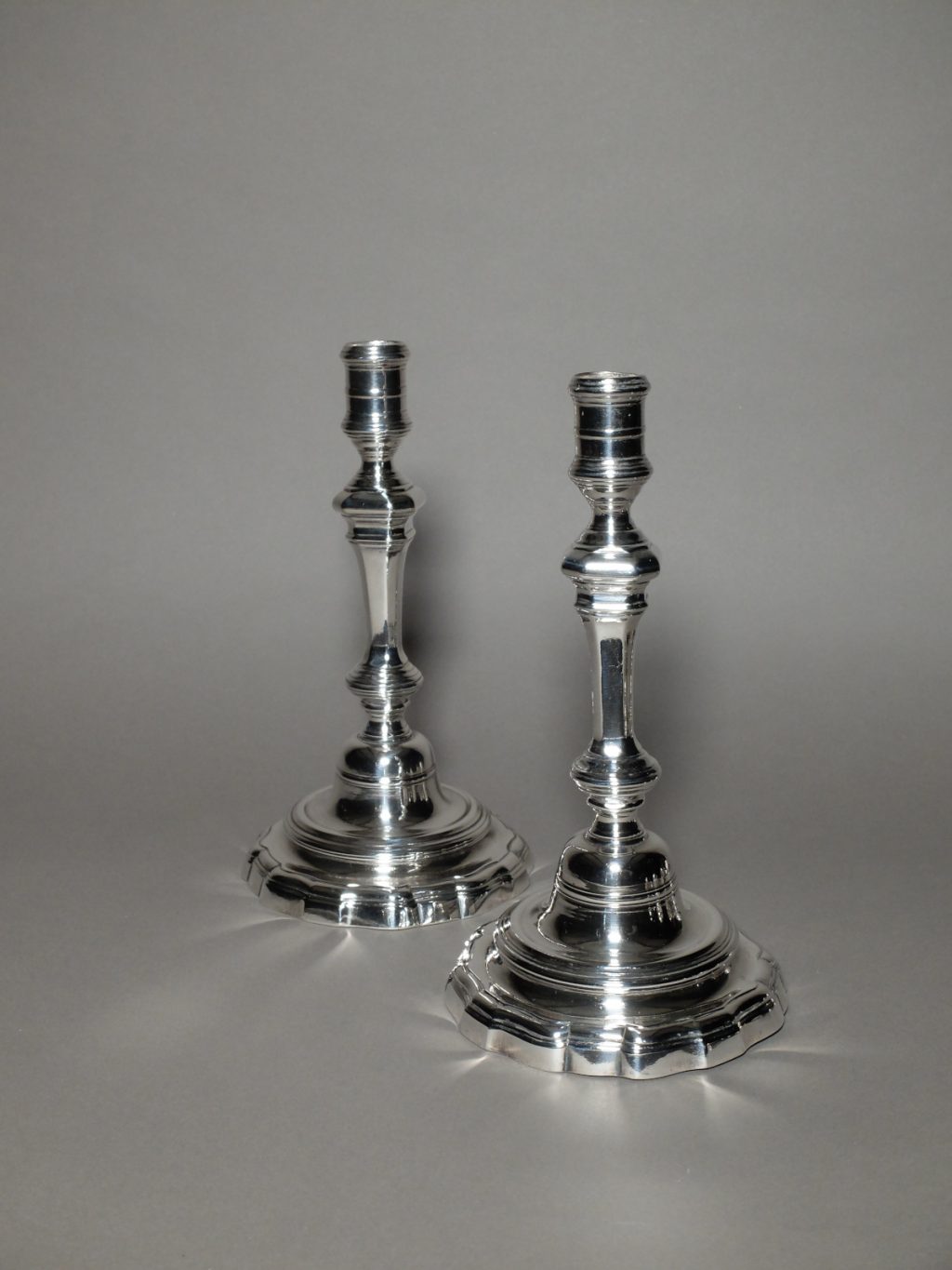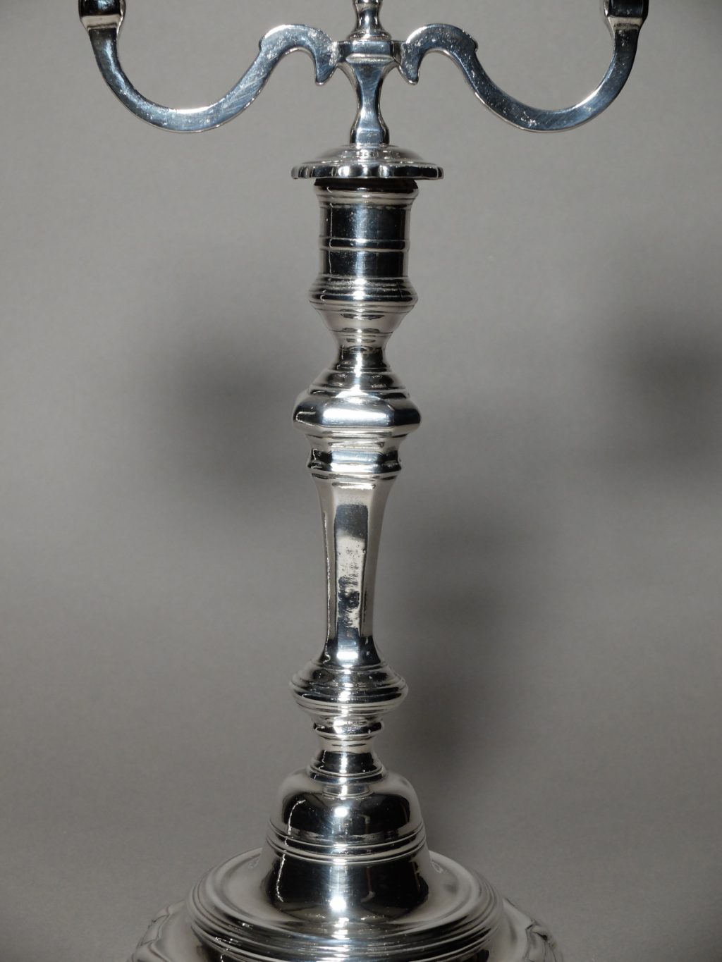 Les bougeoirs de forme chantournée et moulurée, le fût à pans et le binet cylindrique mouluré, supportent un bouquet de 2 feux amovibles permettant d’utiliser ces luminaires soit en paire de bougeoirs soit en bouts de table.