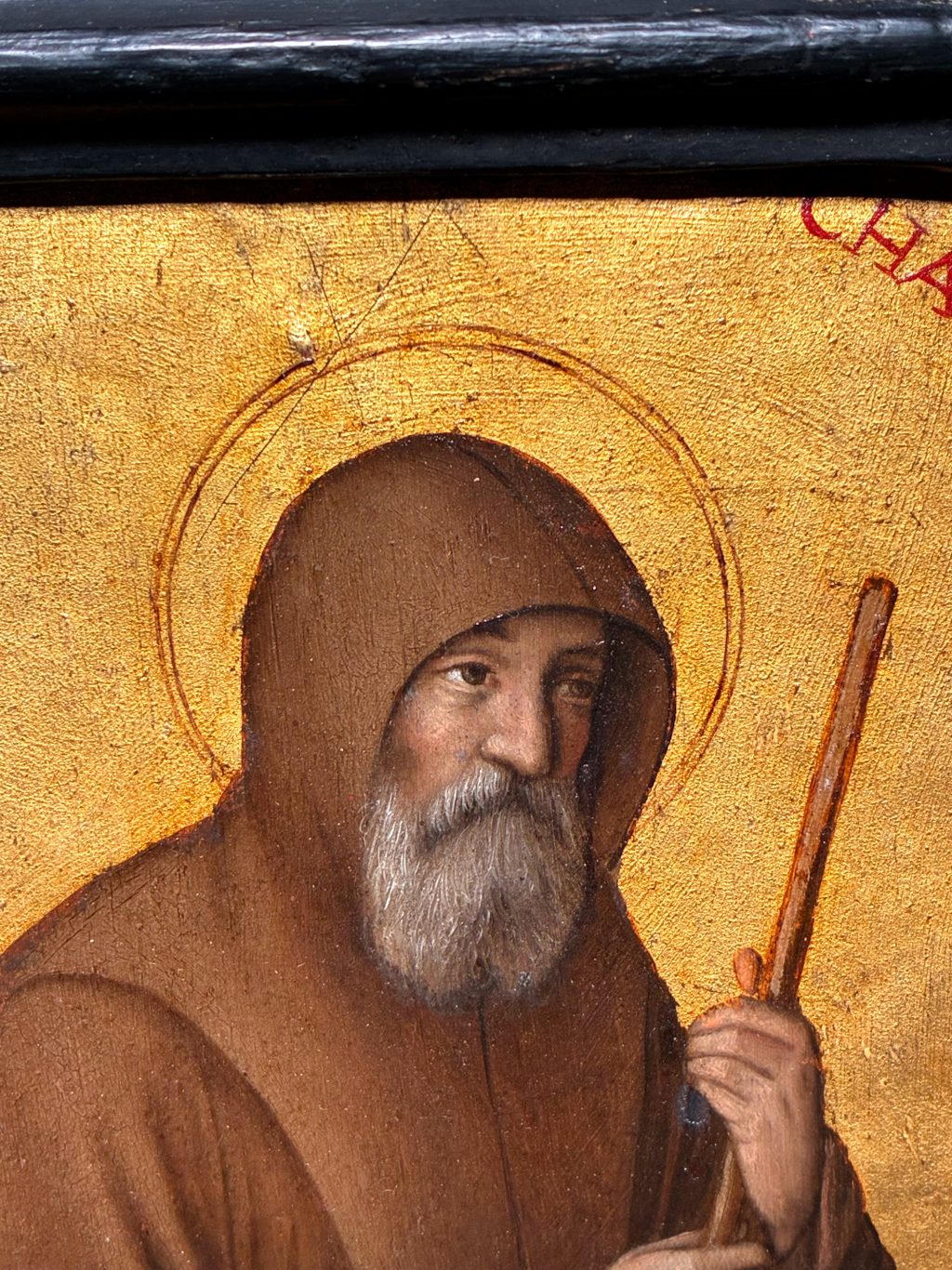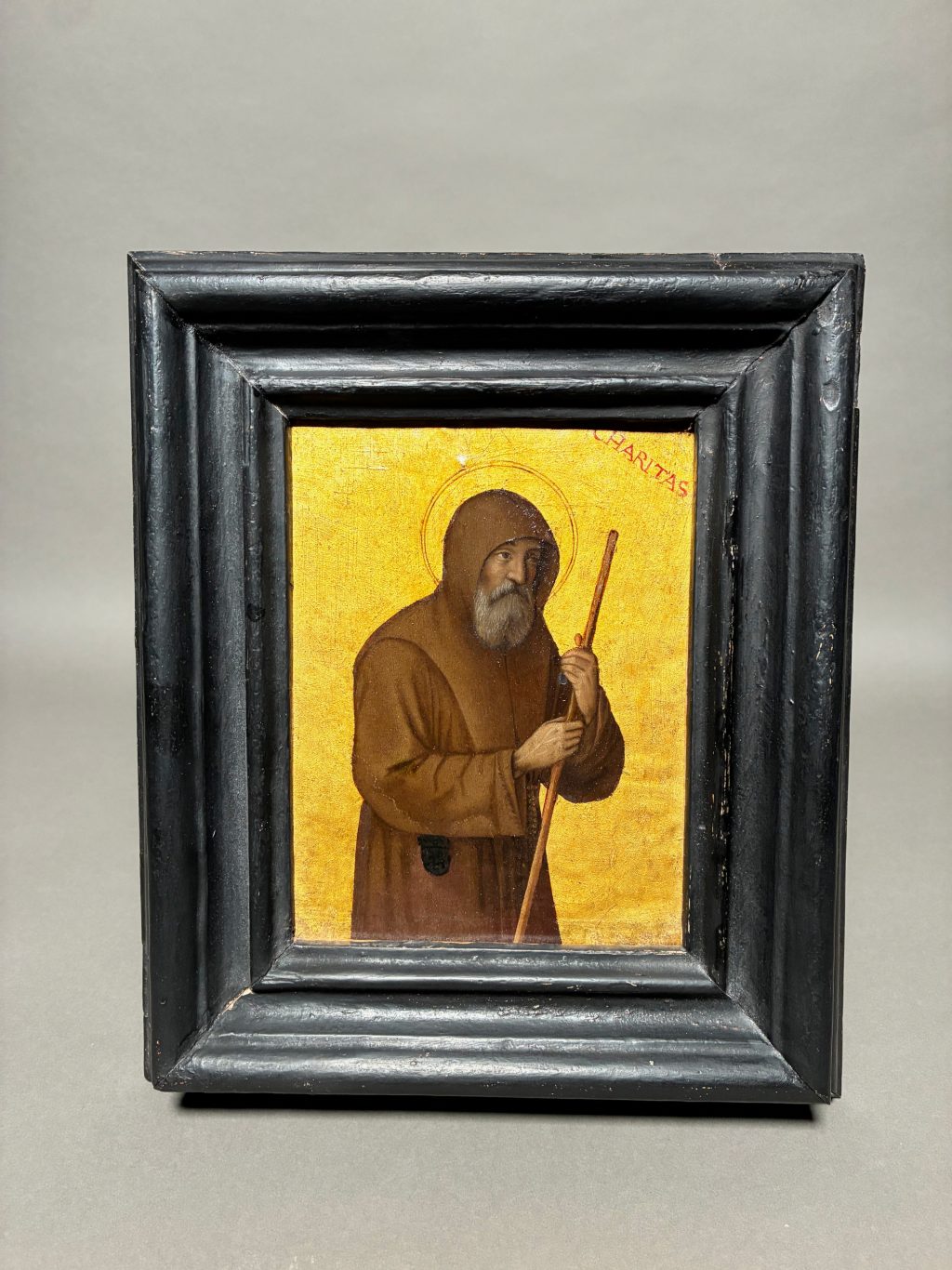 Peint sur un fond d’or encore caractéristique de la peinture du moyen-age, cette représentation du moine ermite tenant son bâton dans la main confirme l’iconographie de St François par la présence dans le ciel de l’inscription « Charitas ».