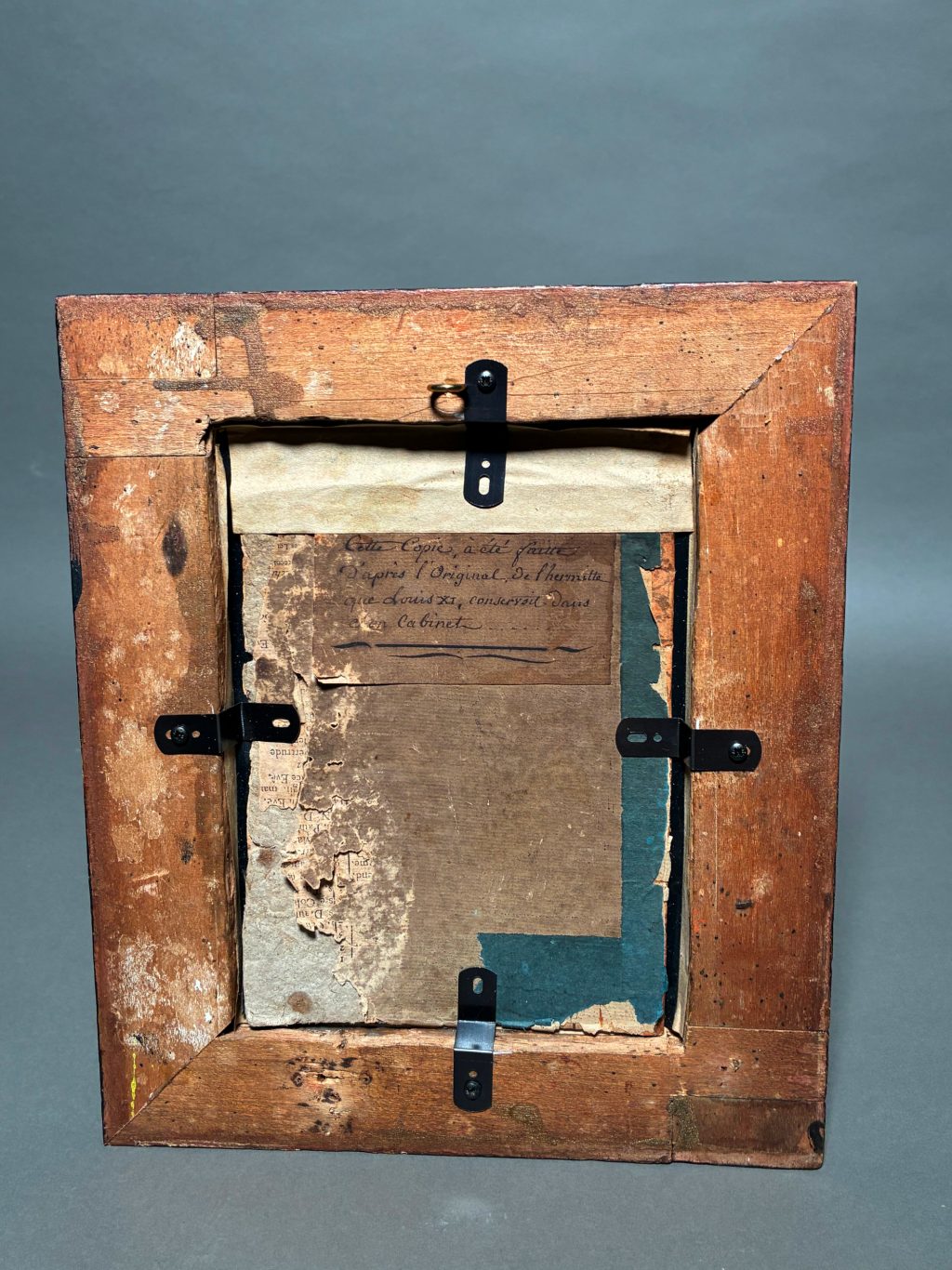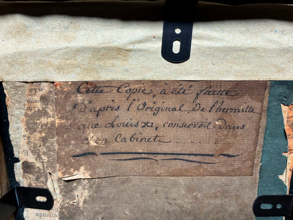 Au dos, une inscription ancienne sur papier, nous donne l’indication suivante: « Cette copie a été faite d’après l’original de lhermitte que Louis XI, conservoit dans son cabinet ».